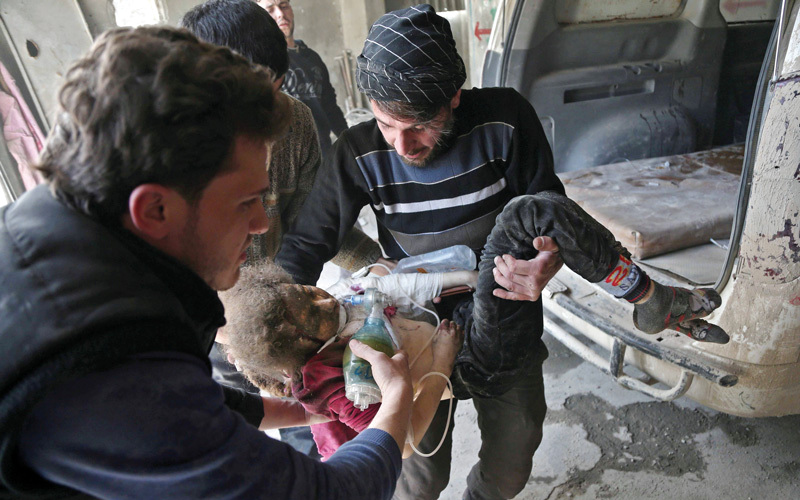 إسعاف طفلة أصيبت بقصف لقوات النظام على بلدة حمورية في منطقة الغوطة الشرقية المحاصرة على مشارف دمشق. أ.ف.ب
