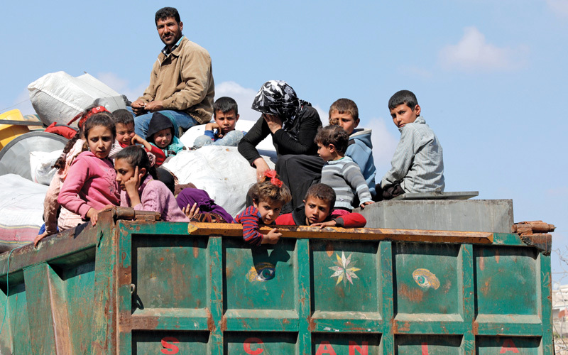 عائلة تفرّ في شاحنة هرباً من هجوم الجيش التركي شمال شرق عفرين. رويترز