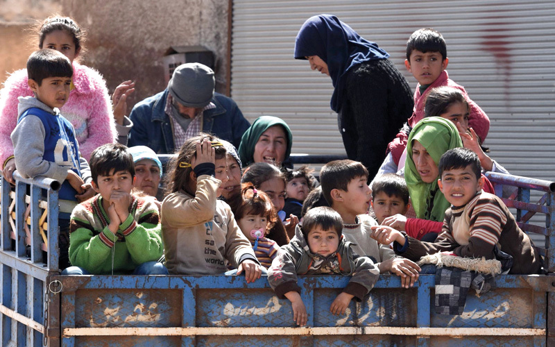 مدنيون من أهالي عفرين ينزحون منها عقب السيطرة التركية عليها إلى حلب حيث سيطرة قوات الحكومة السورية. أ.ف.ب