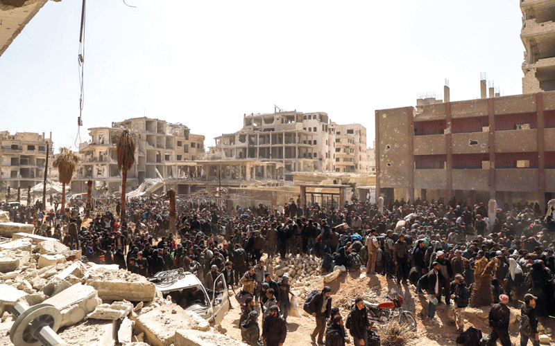 سوريون يتجمعون في بلدة عربين تمهيداً لمغادرة منطقة الغوطة الشرقية إلى إدلب. أ.ف.ب