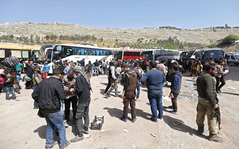مدنيون ومسلحون تم إجلاؤهم من الغوطة الشرقية لدى وصولهم إلى قرية قلعة المضيق بحماة في طريقهم إلى إدلب. أ.ف.ب