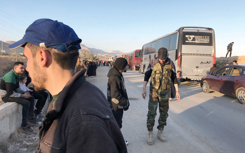 مدنيون ومسلحون ينتظرون رفاقهم بالقرب من الحافلات لإجلائهم من دوما باتجاه الشمال السوري. إي.بي.إيه