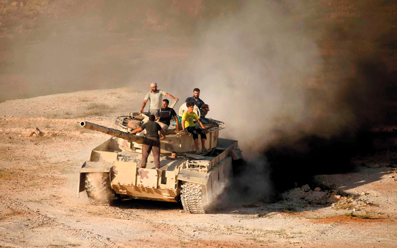 مسلحون من المعارضة السورية يركبون دبابة في درعا. أ.ف.ب