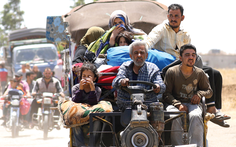 عائلات سورية خلال نزوحها من درعا نتيجة غارات جيش النظام. رويترز