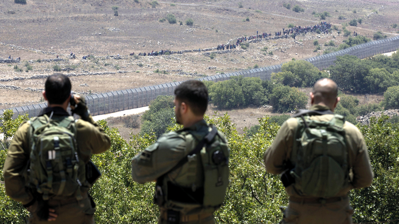 جنود إسرائيليون يراقبون اقتراب سوريين من السياج الحدودي بالجولان. إي.بي.إيه