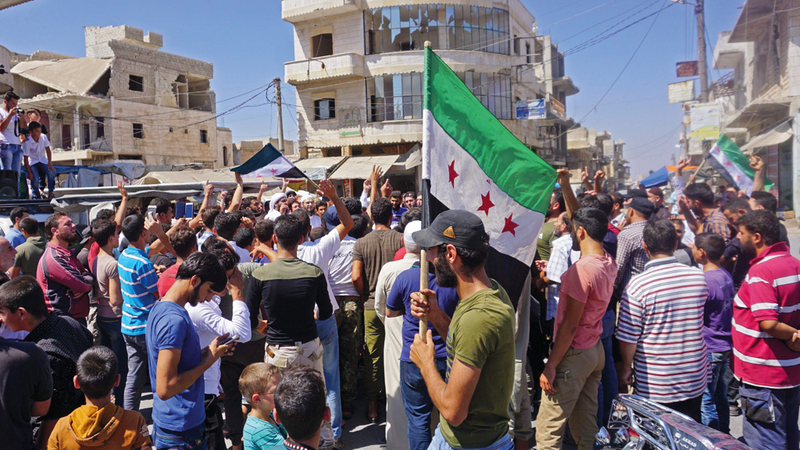 متظاهرون في مناطق سيطرة المعارضة في إدلب يطلقون هتافات ضد النظام وحليفته روسيا. أ.ف.ب