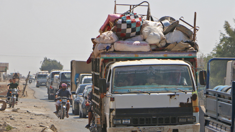 شاحنات تنقل نازحين مع أمتعتهم إلى خارج إدلب خوفاً من هجوم وشيك لقوات النظام. أ.ف.ب