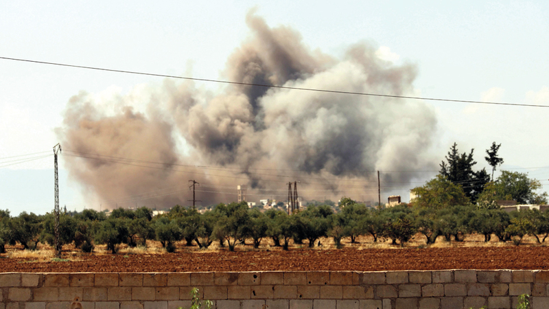 الدخان يتصاعد فوق بلدة المنطار جنوب إدلب نتيجة غارات عنيفة استهدفت المحافظة. أ.ف.ب