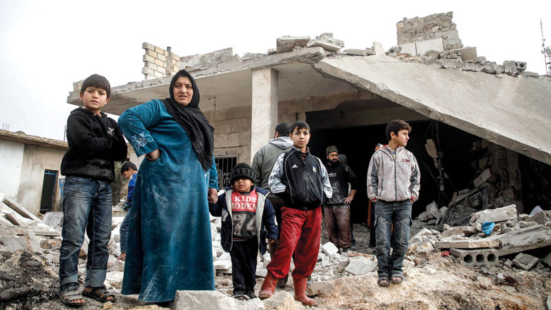أسرة سورية تقف أمام منزل تعرض للقصف في حلب قبل يومين. أ.ف.ب