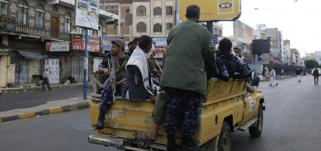 مسلحون حوثيون بزي الشرطة اليمنية خلال دورية بسيارة في إحدى مناطق صنعاء. رويترز