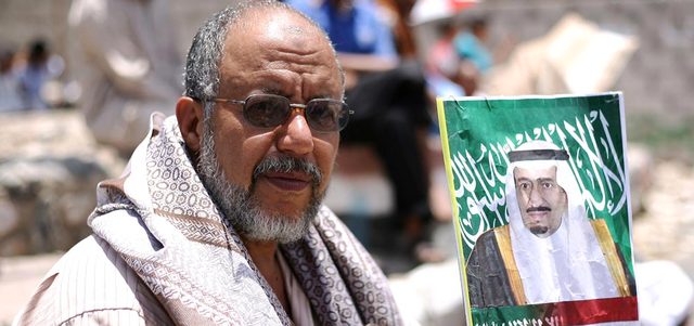 يمني يرفع صورة العاهل السعودي خلال مسيرة مؤيدة للتحالف في تعز. أ.ف.ب