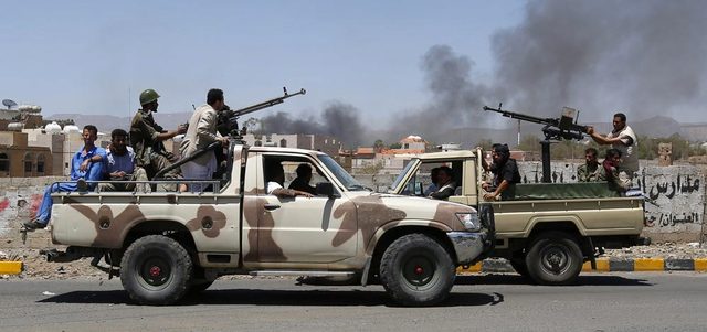 عناصر من المتمردين الحوثيين على متن سيارتين في صنعاء. إي.بي.إيه