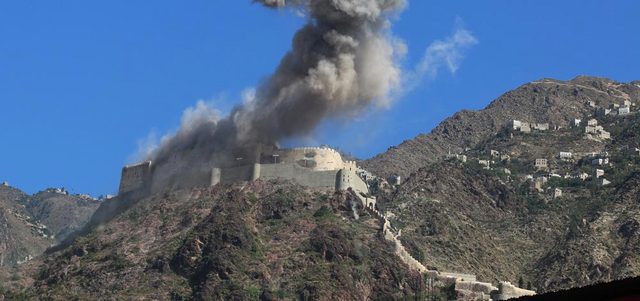 ارتفاع الدخان من قلعة القاهرة القديمة التي يتحصن بها الحوثيون في أعقاب غارة جوية للتحالف على مدينة تعز. أ.ب