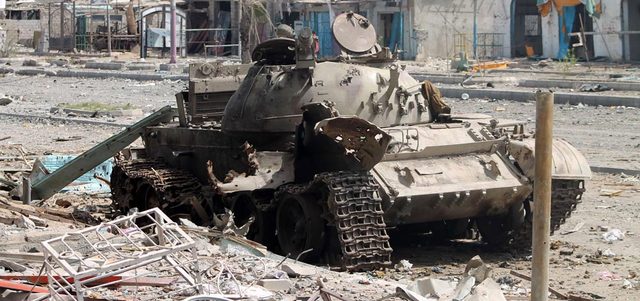 دبابة مدمّرة في أحد شوارع عدن بعد اشتباكات المقاومة الشعبية مع المتمردين الحوثيين. أ.ف.ب