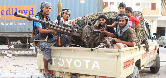 عناصر من المقاومة الشعبية على متن سيارة في إحدى مناطق عدن. أ.ف.ب