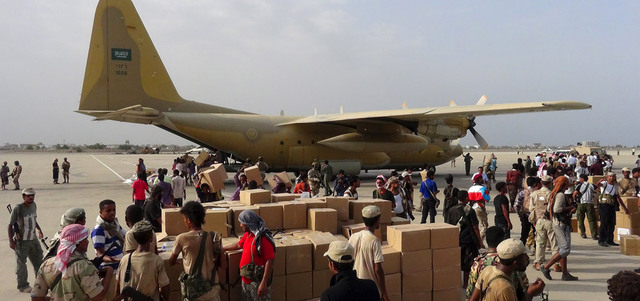 تفريغ شحنة مساعدات من طائرة شحن عسكرية سعودية في مطار عدن. رويترز