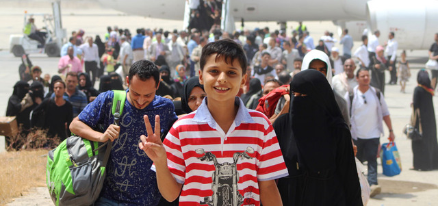 صبي يمني يرفع شارة النصر عقب عودته إلى عدن ضمن لاجئين على متن أول طائرة مدنية تهبط في مطار عدن منذ 4 أشهر. أ.ف.ب
