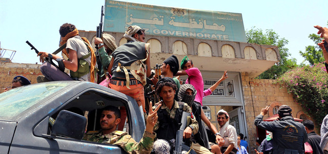 المقاومة الشعبية تستعيد السيطرة على مقر محافظة تعز وإحدى دوريات المقاومة أمام المقر أمس. إي.بي.إيه