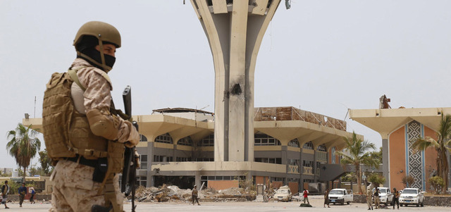 جندي سعودي من قوات التحالف في مطار عدن لحماية طائرات الإغاثة. رويترز