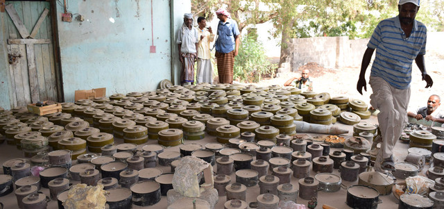 مقاتلون من المقاومة الشعبية يفحصون أمس ألغاماً زرعتها الميليشيات المتمردة في محافظات عدن ولحج وأبين. أ.ف.ب