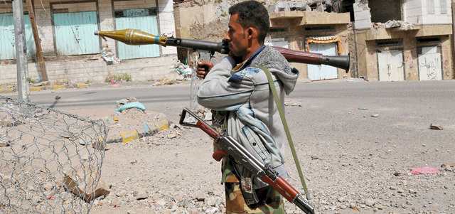 مقاتل من المقاومة الشعبية في مدخل مدينة تعز. رويترز