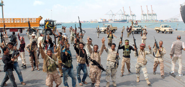 مقاتلو المقاومة الشعبية يرفعون شارة النصر عقب تمكنهم من السيطرة الكاملة على ميناء عدن وتأمينه. أ.ف.ب