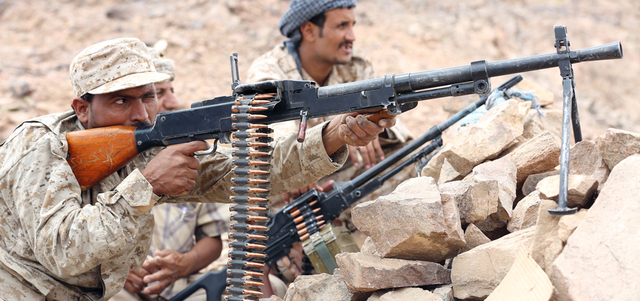 صورة أرشيفية لجندي من قوات الشرعية يطلق النار من مدفع رشاش في محافظة مأرب. رويترز