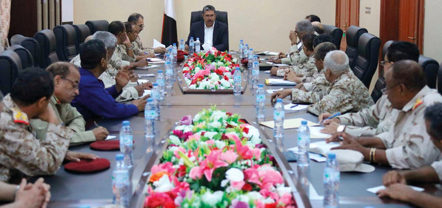 بحاح خلال اجتماعه بقيادات وزارة الدفاع والمنطقة الرابعة. سبأ نت