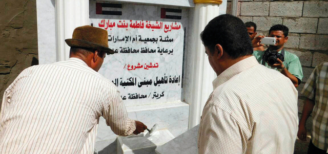 وتتضمن مبادرة سمو الشيخة فاطمة في هذا الصدد تأهيل وترميم المكتبة الوطنية في عدن بمواصفات عالمية، وتجهيزها بالمعدات اللازمة للارتقاء بمستواها في تقديم الخدمات التنويرية التي توفرها للمجتمع، وستكون قريباً جاهزة لاستقبال الطلاب والباحثين الراغبين في التزود بالمعلومات والمعارف المختلفة. وتشمل عمليات الصيانة 12 قاعة لحفظ المستندات والكتب إلى جانب قاعتين رئيستين للقراءة وقاعة للمعارض وأخرى للحاسوب والإنترنت. ويزور المكتبة شهرياً 7359 قارئاً وباحثاً.