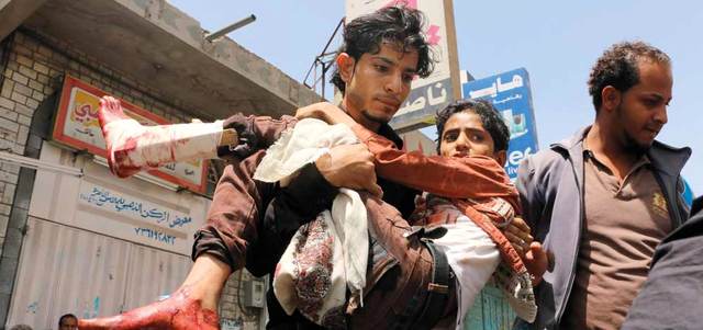 يمني يحمل صبياً أصيب في إحدى مجازر الحوثيين بتعز. أرشيفية ــ أ.ف.ب