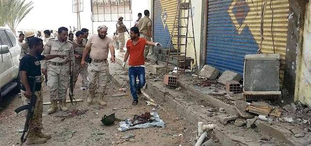قائد قوات الحزام الأمني نبيل المشوشي يتفقد موقع التفجير في كالتكس. الإمارات اليوم