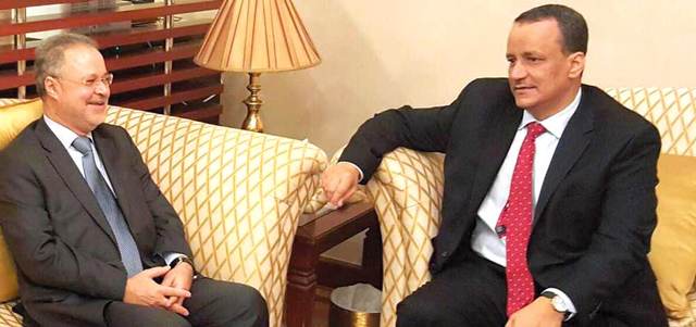 رئيس الوفد الحكومي في مشاورات الكويت خلال لقائه المبعوث الأممي. أرشيفية