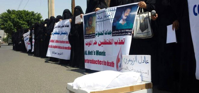 نفذت رابطة أمهات المختطفين لدى ميليشيات الحوثي والمخلوع صالح الانقلابية، أمس، أمام مقر الأمن السياسي بالعاصمة صنعاء، وقفة احتجاجية تنديداً بتعذيب مختطفين في سجون الميليشيات حتى الموت.