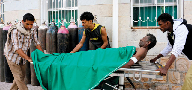 إسعاف أحد المصابين بقصف للميليشيات على تعز. أ.ب