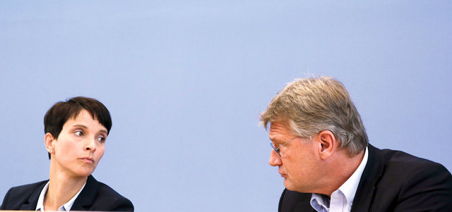 بيتري زعيمة حزب البديل لألمانيا (يسار) تتحدث إلى نائبها يورغ ميوثن، خلال مؤتمر صحافي في برلين عقب تحقيق الحزب مكاسب جديدة. أ.ب