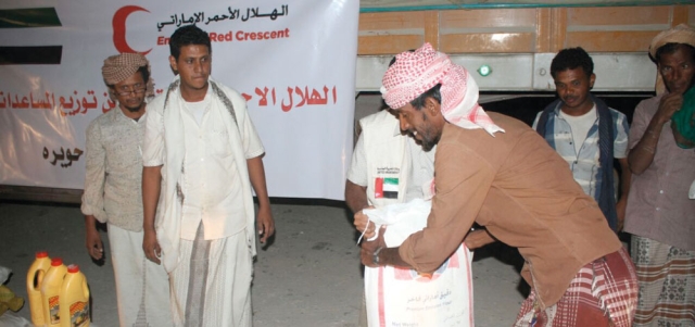 تواصل هيئة الهلال الأحمر الإماراتي جهودها الإغاثية والإنسانية من خلال توزيع المساعدات الغذائية للأسر الفقيرة والمحتاجة في المناطق والقرى النائية في محافظة حضرموت جنوب شرق اليمن، والتي تعاني أوضاعاً صعبة، حيث وزعت الهيئة مساعدات غذائية على سكان مديرية رأس حويرة، إحدى مديريات المحافظة.