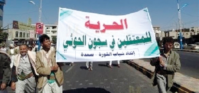 تظاهرة في اليمن تطالب بإطلاق سراح معتقلين لدى جماعة الحوثي. أرشيفية