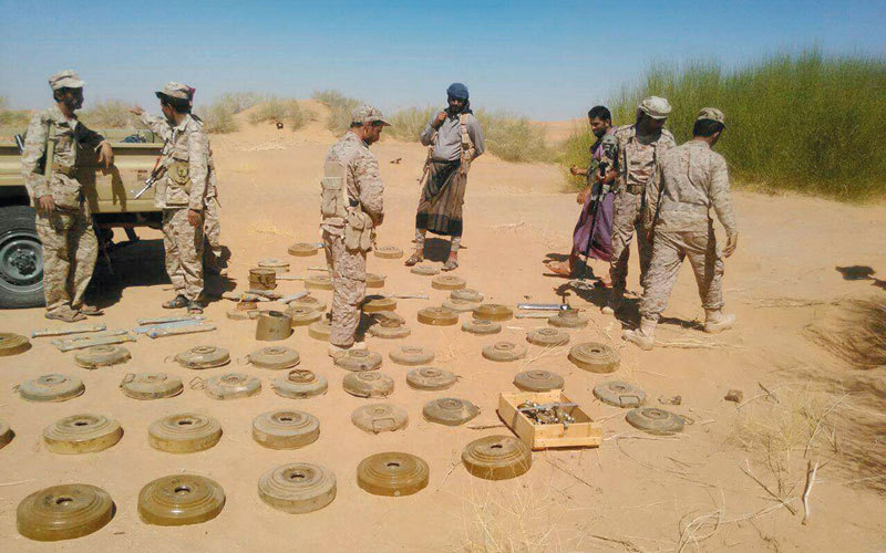 قال قائد الفريق الطبي في الكتيبة الهندسية التابعة للجيش اليمني في شبوة، عبدالله فاران، إن الألغام التي زرعتها الميليشيات بمحافظتي مأرب وشبوة، تسببت في حصد أرواح 100 مدني، وجرح 200 آخرين حتى الآن. وأكد فاران أن غالبية الجرحى تعرضوا لإعاقات دائمة. يأتي ذلك في وقت فجرت الفرق الهندسية التابعة للجيش، أمس، 670 لغماً وعبوات ناسفة، كانت الميليشيات زرعتها في وادي ذهبا ومنطقة الساق شمال مديرية بيحان غرب محافظة شبوة. وأضاف أن «الميليشيات قامت بتحويل الألغام الكبيرة المخصصة للدبابات والعربات إلى ألغام قابلة للانفجار، في حال تعرضت للدهس من قبل الأفراد والمواشي والسيارات الصغيرة، وتقوم بربط الألغام ببطاريات قابلة للانفجار في حال تعرضت لدهس جسم لا يقل عن 10 كغم».