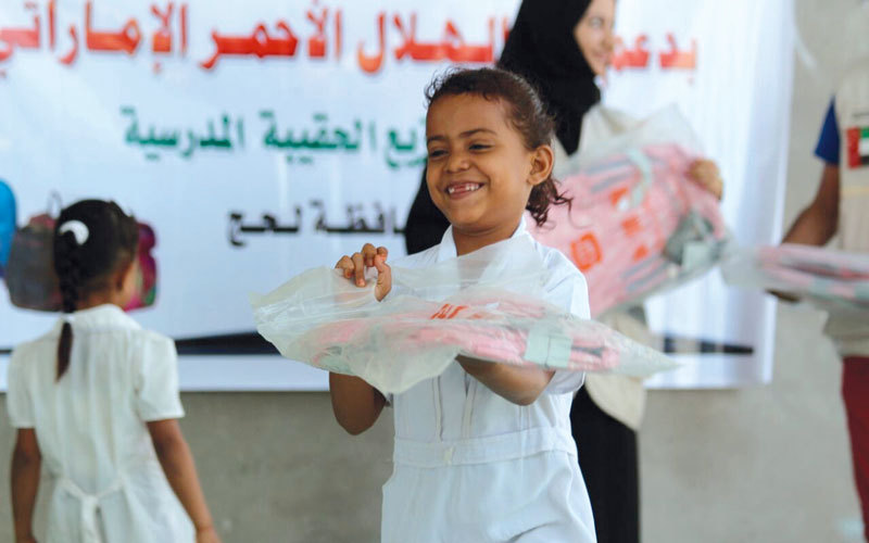 وقام الفريق التطوعي للهلال الأحمر الإماراتي بتوزيع 300 حقيبة مدرسية في مدرستي «الشهيد جندور» و«عمر بن عبدالعزيز».