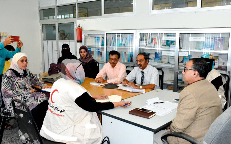 خلال اجتماع منسقة «الهلال الأحمر» في عدن مع رئيس جامعة عدن. الإمارات اليوم