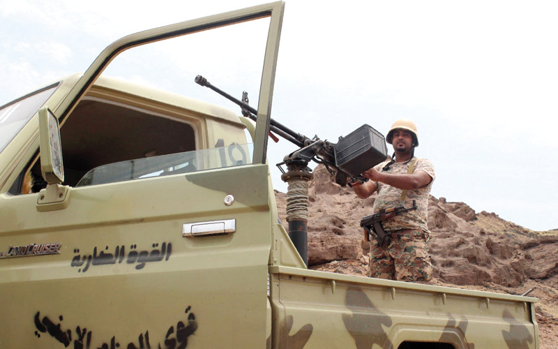 مقاتل من «الشرعية» في منطقة كهبوب الاستراتيجية شمال شرق باب المندب. أ.ف.ب
