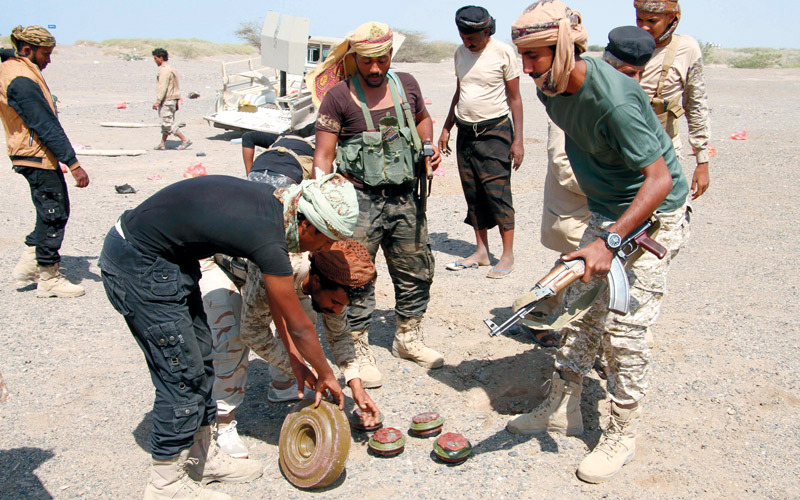 قوات الشرعية خلال تفكيك الألغام التي زرعتها الميليشيات في المخاء. أ.ف.ب
