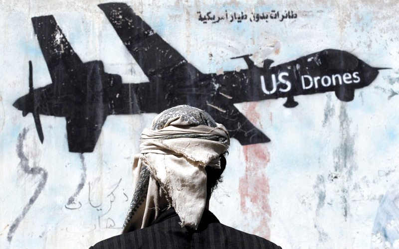 يمني يقف أمام «غرافيتي» لطائرة أميركية من دون طيار على أحد الجدران. إي.بي.إيه
