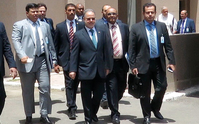المخلافي خلال مشاركته في مشاورات السلام مع الميليشيات في الكويت. أرشيفية
