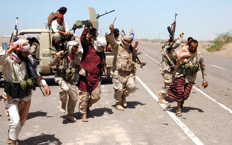 مقاتلون من الجيش اليمني يبتهجون برفع أسلحتهم بعد تمكنهم من تطهير كامل مدينة المخاء ومينائها من الميليشيات. أ.ف.ب