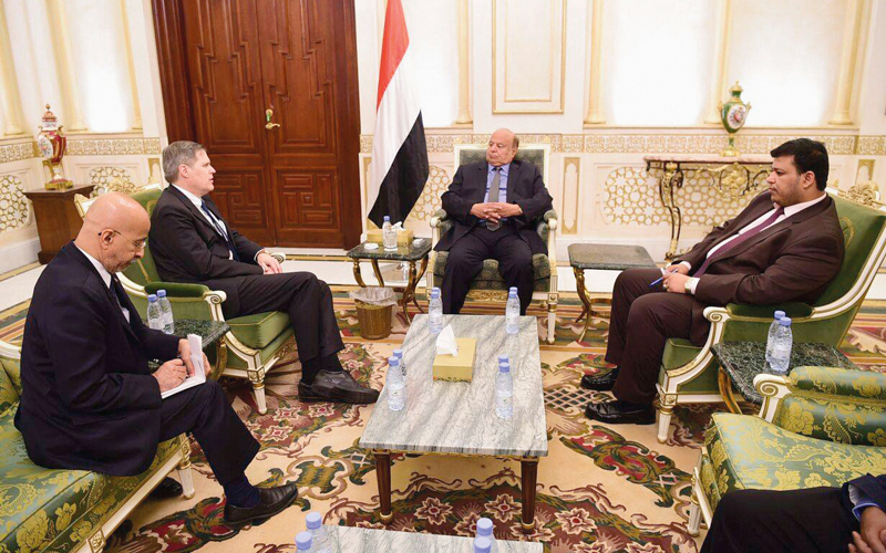 وأشاد الرئيس اليمني بوحدة الهدف في مواجهة تلك التحديات مع الإدارة الأميركية والمجتمع الدولي، وتناول اللقاء المستجدات المختلفة، وعملية تطبيع الأوضاع وعودة الحياة تدريجياً في المناطق المحررة، والحاجة الماسة إلى تعزيز الخدمات، منها الكهرباء في العاصمة المؤقتة عدن لمواجهة الصيف المقبل، فضلاً عن أهمية انتظام الرحلات الجوية، لتخفيف المعاناة على الجرحى والمرضى وتنقل العائلات.