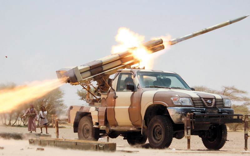 قاذفة صواريخ للمقاومة اليمنية تطلق صاروخاً باتجاه مواقع للميليشيات في مأرب. أرشيفية