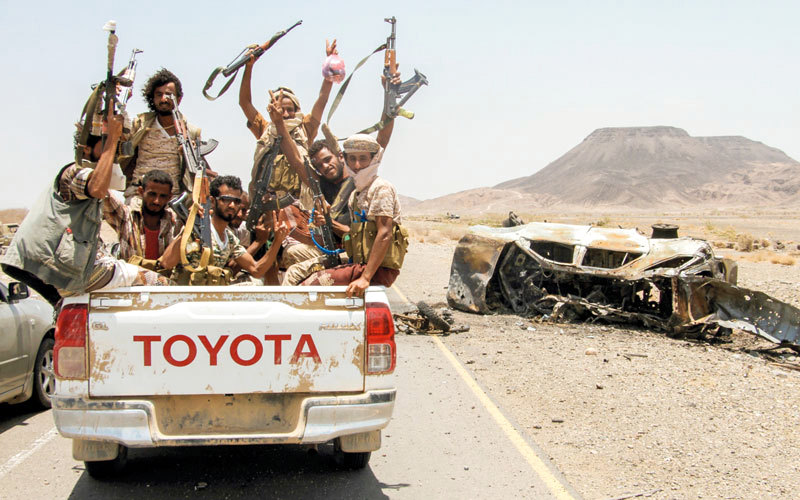 مقاتلون من الشرعية في الطريق لمعسكر خالد شرق المخاء. أ.ف.ب