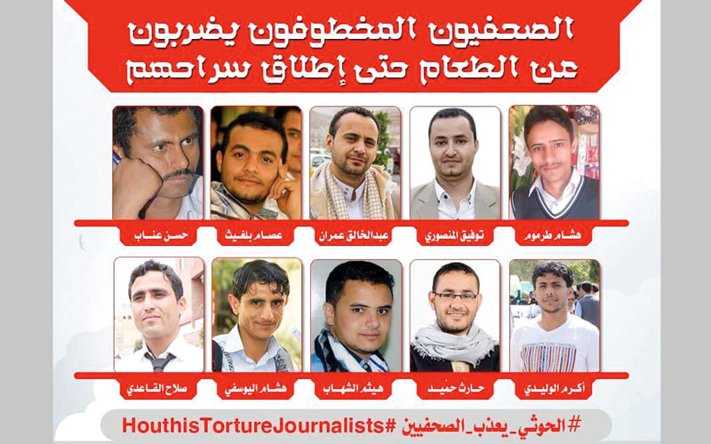 مجموعة من الصحافيين الذين اختطفتهم ميليشيات الحوثي. أرشيفية