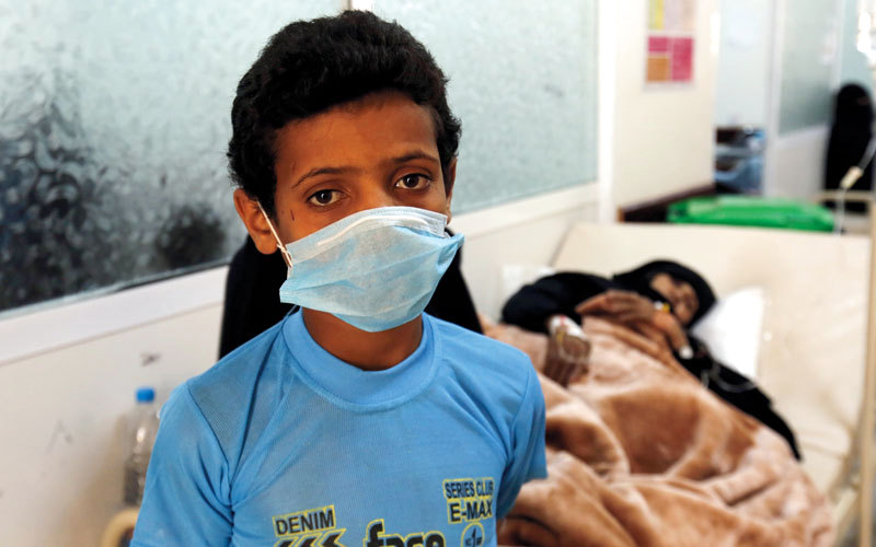 طفل يرتدي قناعاً بالقرب من أمه المصابة بـ «الكوليرا» في صنعاء. إي.بي.إيه